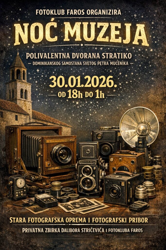 Fotoklub Faros organizira Noć muzeja 2026. u Polivalentnoj dvorani Stratiko, u sklopu Dominikanskog samostana svetog Petra Mučenika.